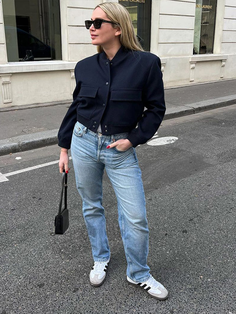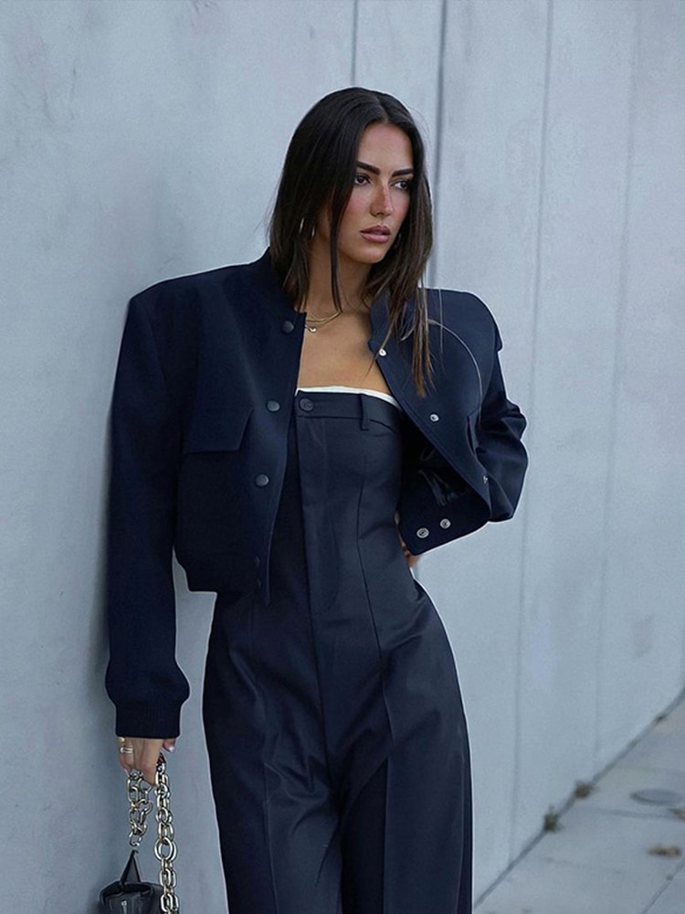 2023 Spring Casual Dark Blue Bomber Jacket Women Fashion Single Breasted Cropped Outerwear Ladies Chic Street Pocket Coat