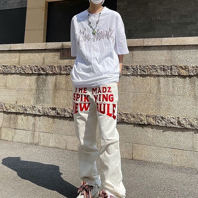 American Niche White Red Letter Printed Casual Pants Retro Trend Hip-hop Street Tooling Trousers Men's and Women's Fashion